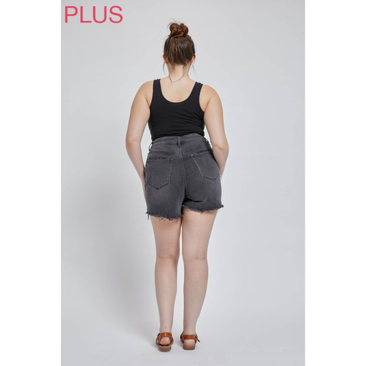 Mica: Curvy High-Rise Distressed Black Shorts