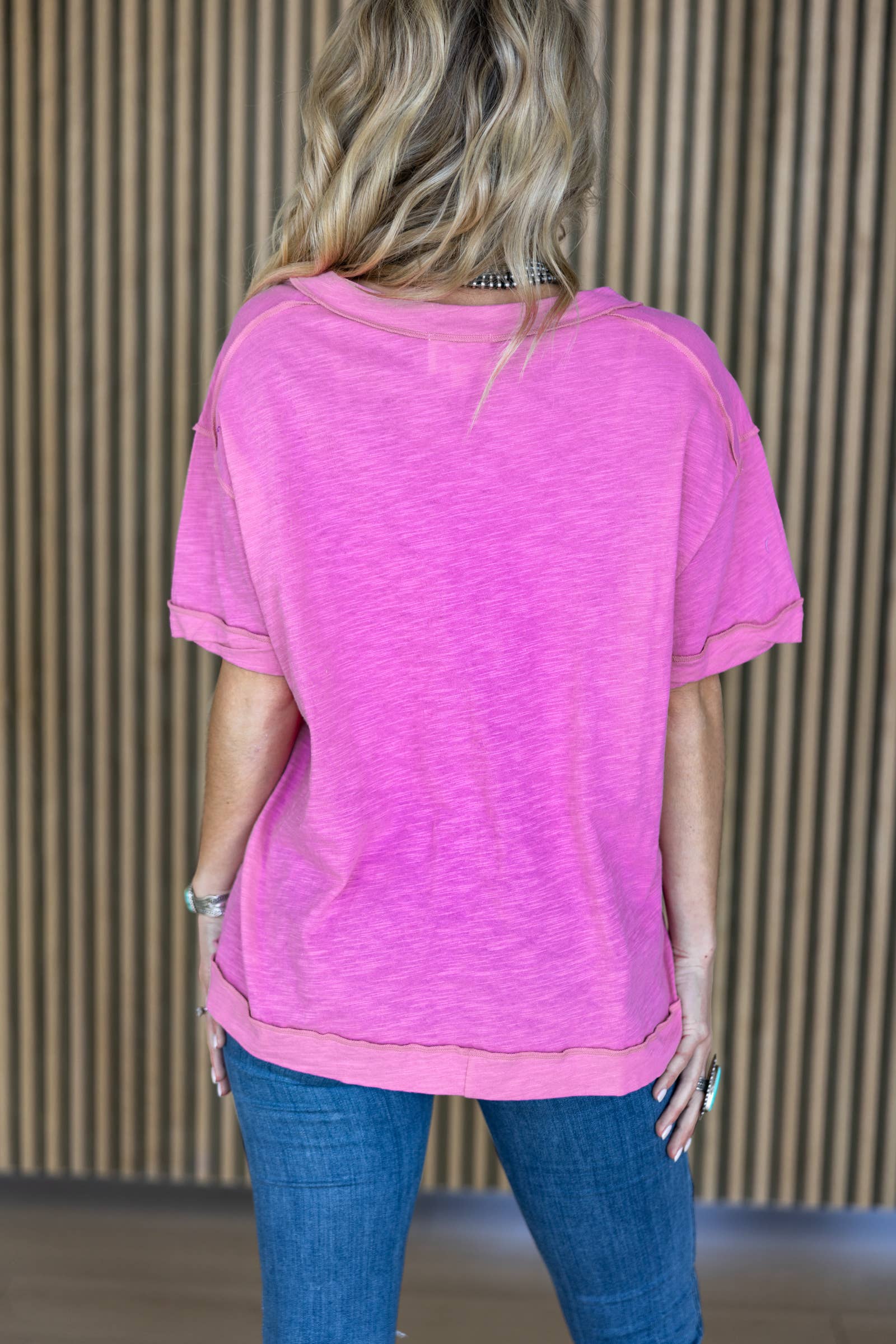 Add a touch of relaxed style to your wardrobe with this v neckline cotton top. Featuring short sleeves and unique raw edge details, this top combines comfort with a modern, edgy look! Perfect for casual days! Knit, stretchy.