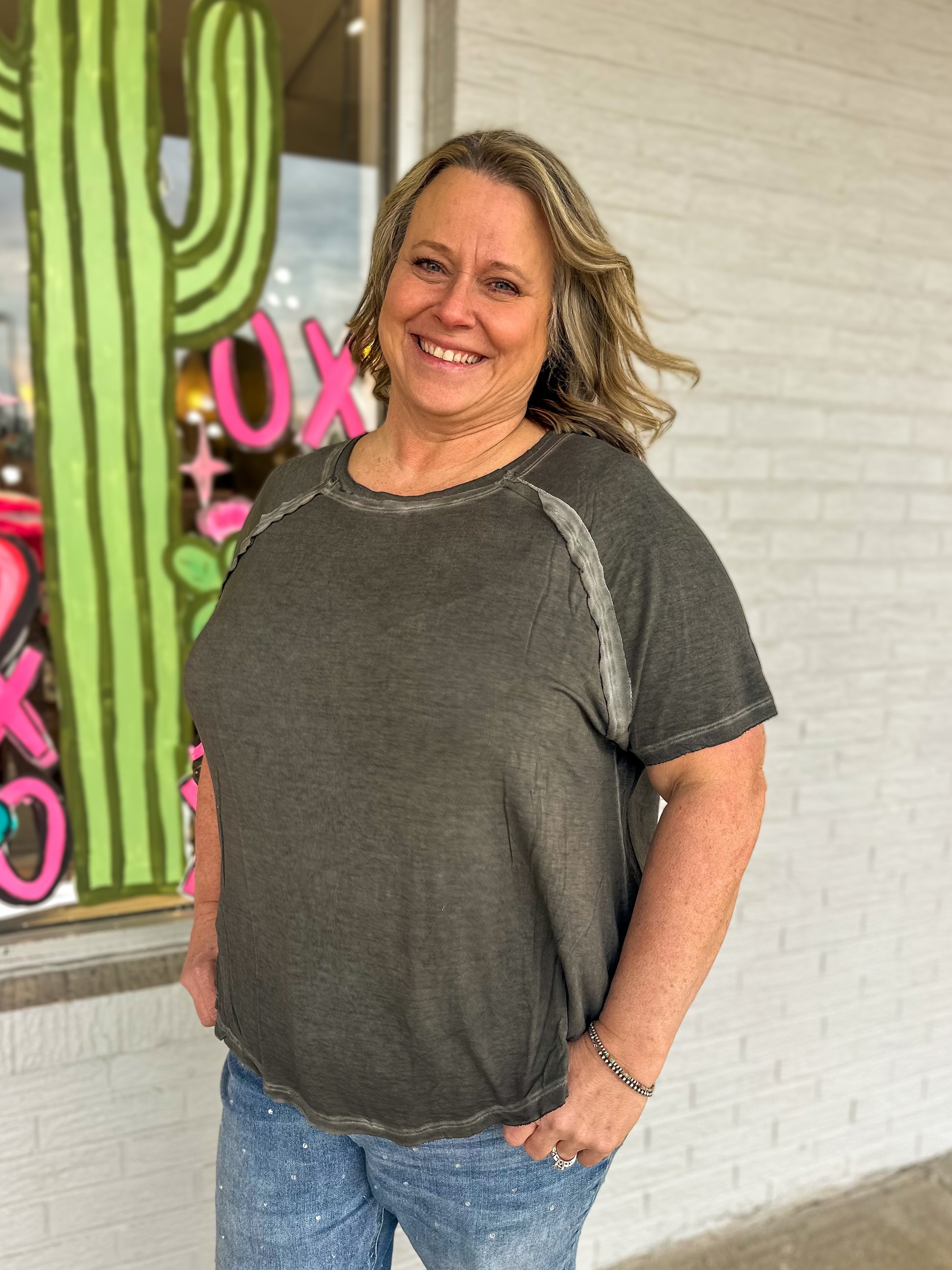 WASHED SHORT SLEEVE BOAT-NECK TOP W HI-LOW HEM