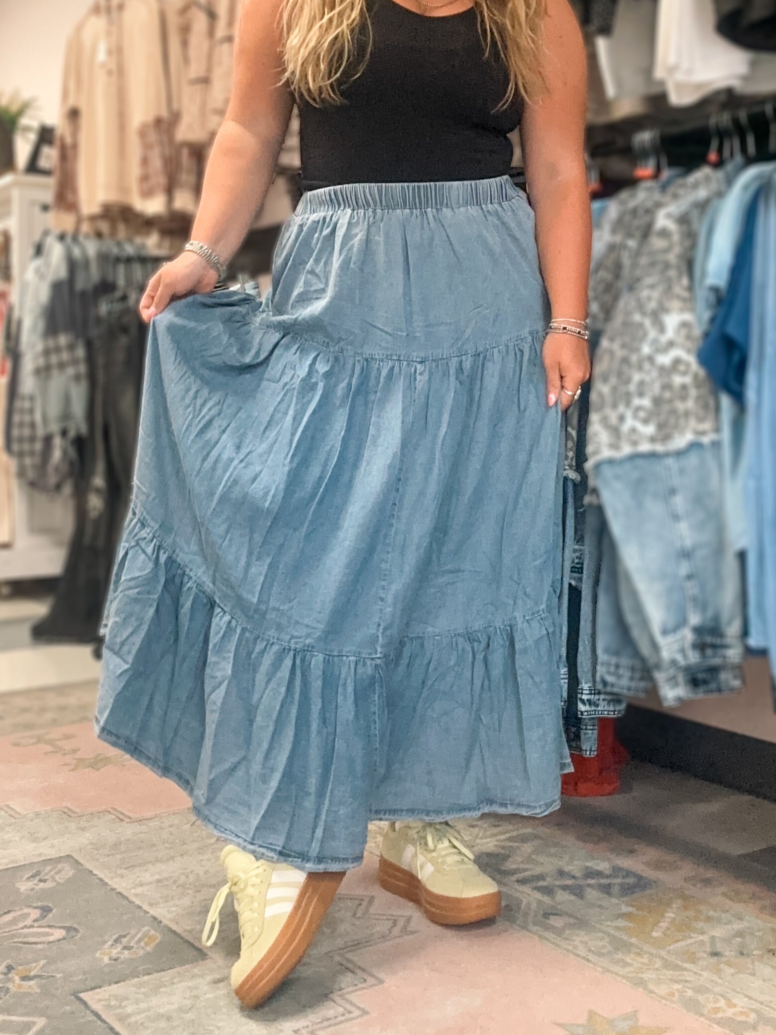 Washed Denim Flowy Maxi Skirt